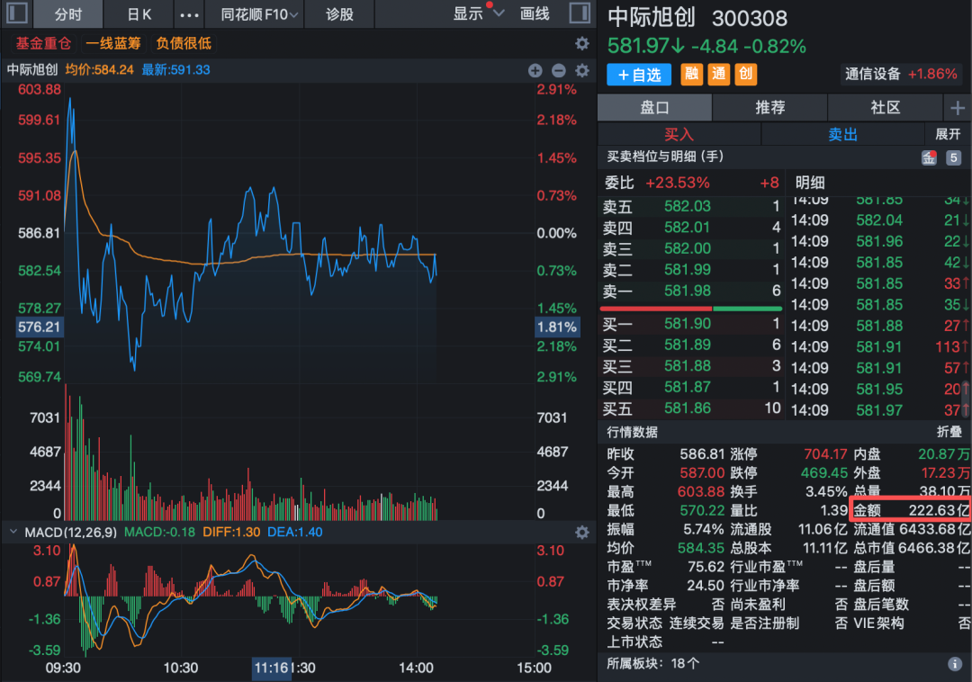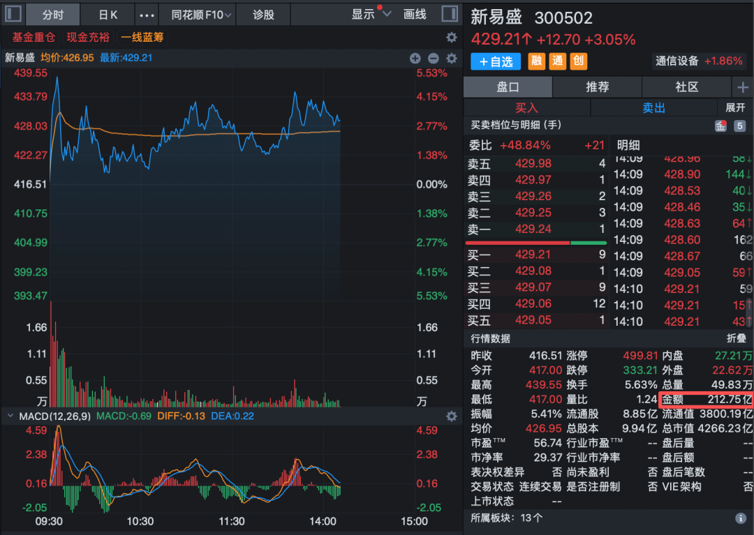多只个股午后异动拉升。 中兴通信午后拉升。港股一度涨超5%;A股拉升翻红,早盘一度跌超3%。公司12月12日午间公告称,拟使用自有资金以聚拢竞价往复面貌回购公司A股股份,用于现实公司职工抓股打算好像股权激发。本次回购资金总数为不低于10亿元且不跨越12亿元。 ![]() 多只基金重仓股、大基金抓股短线拉升。燕东微、拓荆科技涨超10%。 ![]() 中际旭创(300308)、(300502)两只股票均属于基金重仓股,成交额均冲突200亿元。 ![]() ![]() 责编:陈丽湘 校对 :盘达